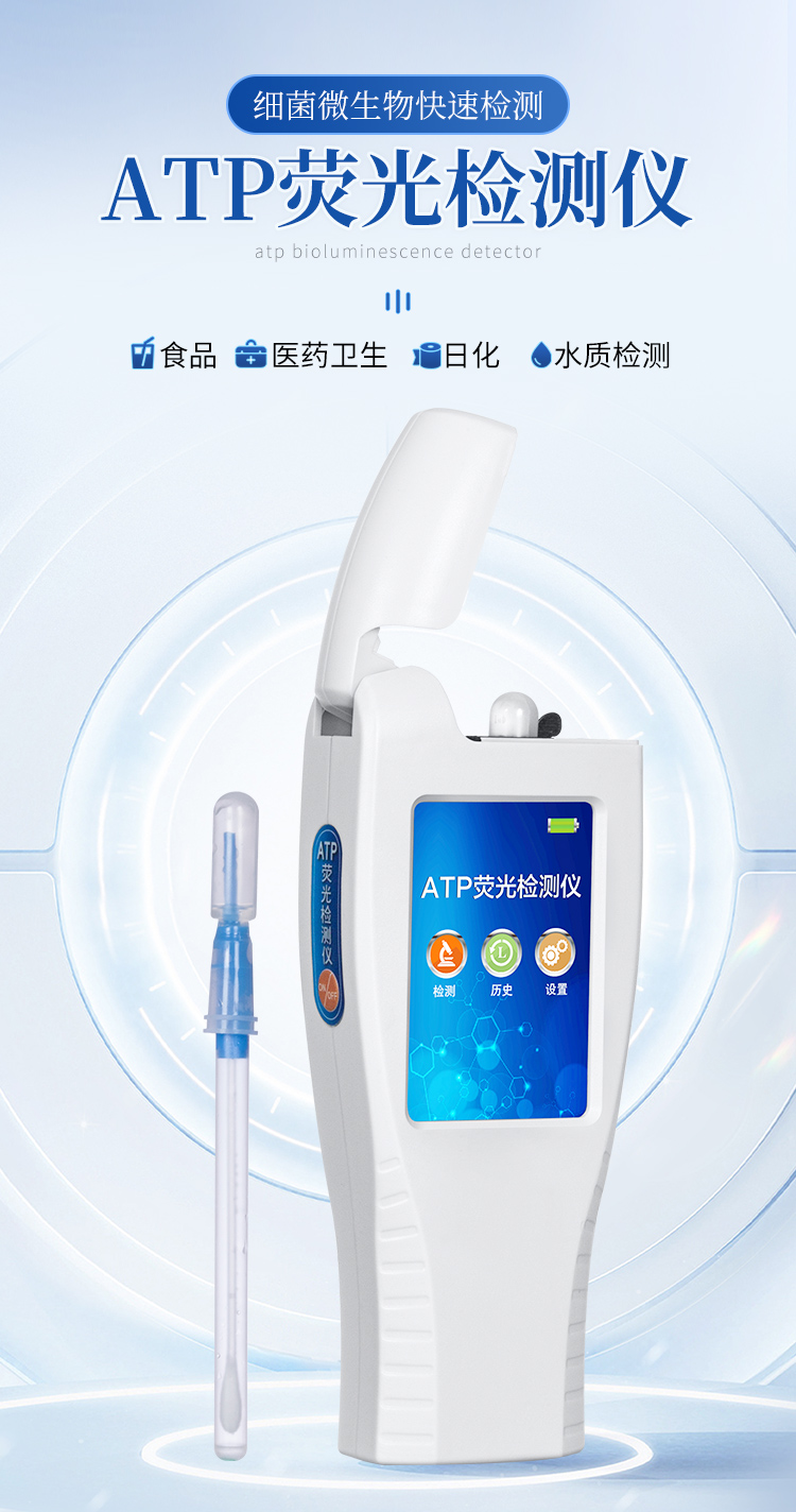 該設備為全新升級產品,大屏幕觸摸顯示屏,代替傳統按鍵。操作采用生物化學反應方法檢測ATP含量,ATP熒光檢測儀基于螢火蟲發光原理,利用“熒光素酶—熒光素體系”快速檢測三磷酸腺苷(ATP)。ATP拭子含有可以裂解細胞膜的試劑,能將細胞內ATP釋放出來,與試劑中含有的特異性酶發生反應,產生光,再用熒光照度計檢測發光值,微生物的數量與發光值成正比,由于所有生物活細胞中含有恒量的ATP,所以ATP含量可以清晰地表明樣品中微生物與其他生物殘余的多少,用于判斷衛生狀況。
