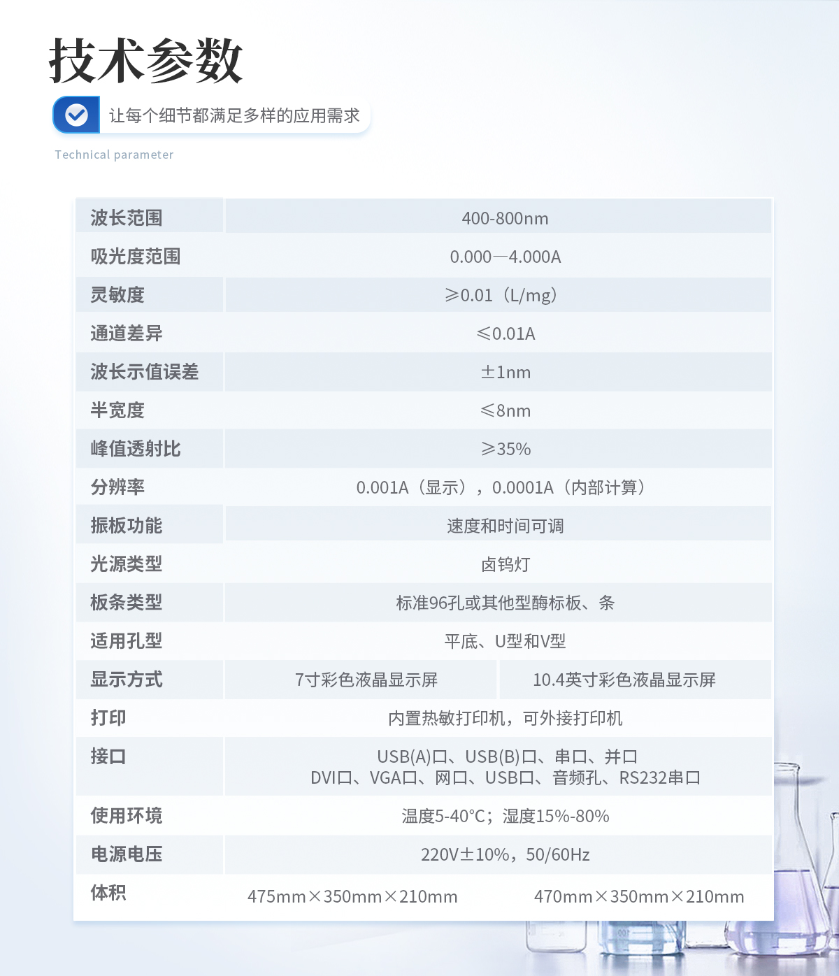 | 波長范圍: 400-800nm | *濾光片配置:10個濾光片位置,標配405nm、450nm、492nm、630nm,選配6定制波長 | 吸光度范圍:0.000―4.000A | *光通道數:8通道光路檢測,另設一個獨立參比通道 | *示值穩定性:≤±0.002A或≤0.5%T/10min。 | *示值誤差(準確性):≤±0.005A或±0.2%T | *重復性:≤0.2%或≤0.2%T。 | 靈敏度:≥0.01(L/mg)。 | 通道差異:≤0.01A。 | 波長示值誤差:±1nm | 半寬度:≤8nm | 峰值透射比:≥35% | 分辨率:0.001A(顯示),0.0001A(內部計算) | *讀板速度:單波長≤3秒/96孔,雙波長≤6秒/96孔 | 振板功能:速度和時間可調 | 光源類型:鹵鎢燈 | 板條類型:標準96孔或其他型酶標板、條 | 適用孔型:平底、U型和V型 | *顯示方式:10.4英寸彩色液晶顯示屏顯示 | 輸入方式:觸摸屏輸入,可選配鼠標和鍵盤 | 打印:內置熱敏打印機,可外接打印機 | 接 口:DVI口、VGA口、網口、USB口、音頻孔、RS232串口 | 使用環境:溫度5-40℃;濕度15%-80% | 電源電壓:220V±10%,50/60Hz | 體積:470mm×350mm×210mm(長×寬×高) | 重量:11.5Kg |