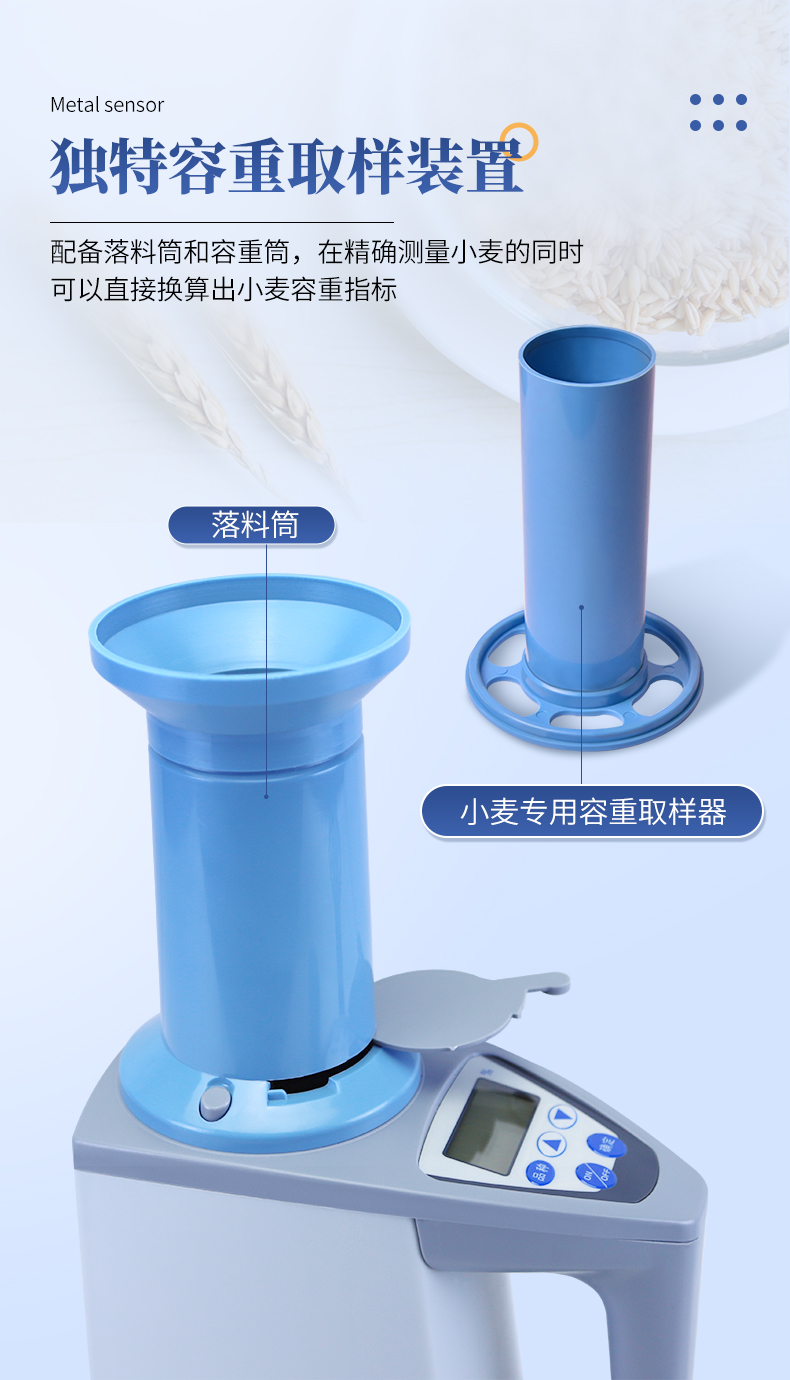 糧食水分測定儀獨(dú)特的專利容重取樣裝置在**測量小麥的同時,可以直接換算出小麥容重指標(biāo)。 熱線:133-7109-8225