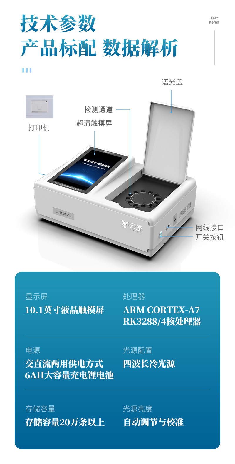 山東云唐智能科技有限公司生產(chǎn)的果蔬肉類檢測儀,采用臺式一體化設(shè)計(jì),可快速檢測幾十種項(xiàng)目,包含各種蔬菜水果中有機(jī)磷和氨基甲酸酯類農(nóng)藥殘留,病害肉診斷:肉中組胺、揮發(fā)性鹽基氮;各種肉食品中瘦肉精激素類殘留、抗生素、獸藥殘留等現(xiàn)場的定性定量檢測。