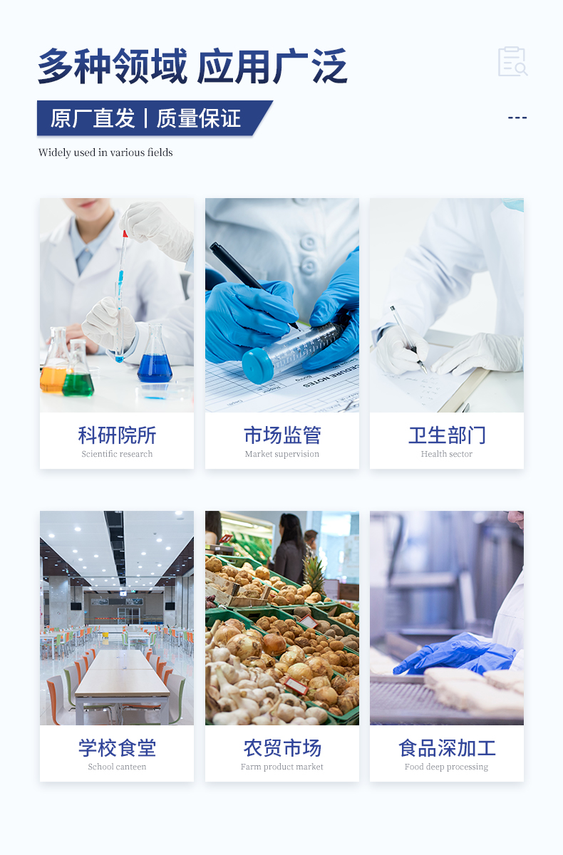 可快速檢測各類食品中的甲醛、二氧化硫、亞硝酸鹽的含量,儀器預留其他項目檢測程序和端口,根據日后需求可方便的自主增加檢測項目。