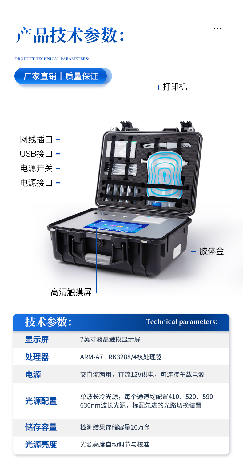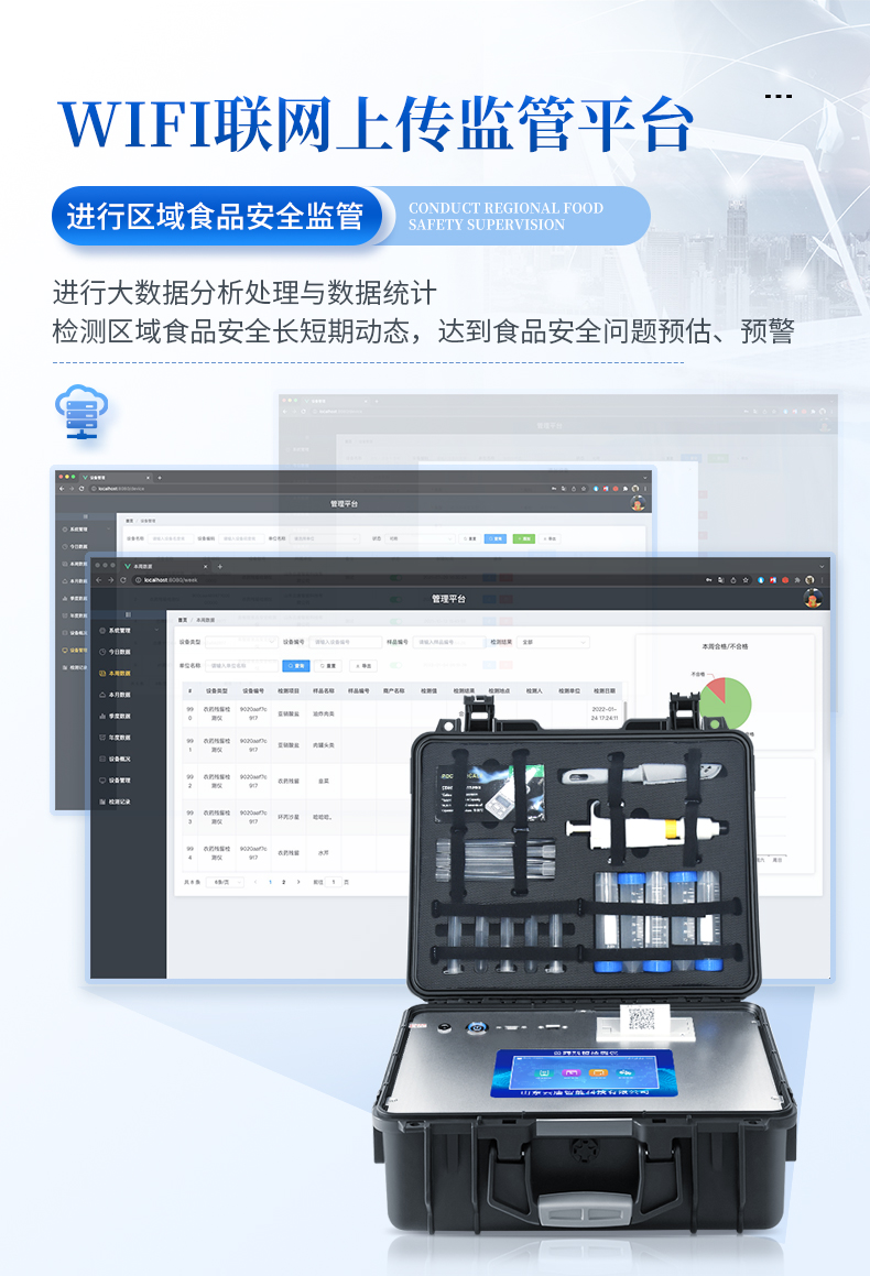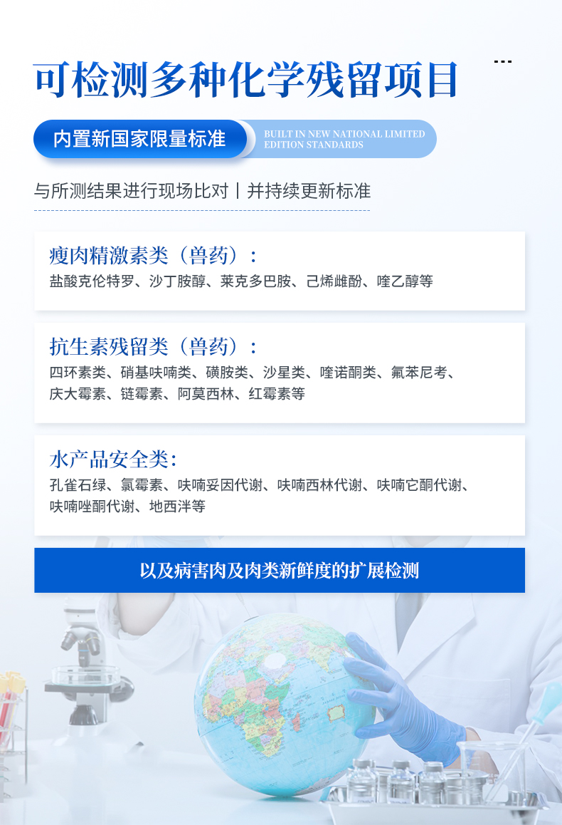 3.☆檢測項目:可檢測農(nóng)藥殘留、食品添加劑、色素、可現(xiàn)場快速檢測農(nóng)藥殘留、鹽酸克倫特羅、沙丁胺醇、萊克多巴胺、四環(huán)素類、硝基呋喃類、磺胺類、沙星類、氯霉素、孔雀石綠磺胺類,并且可以連接食品安全監(jiān)控系統(tǒng)。