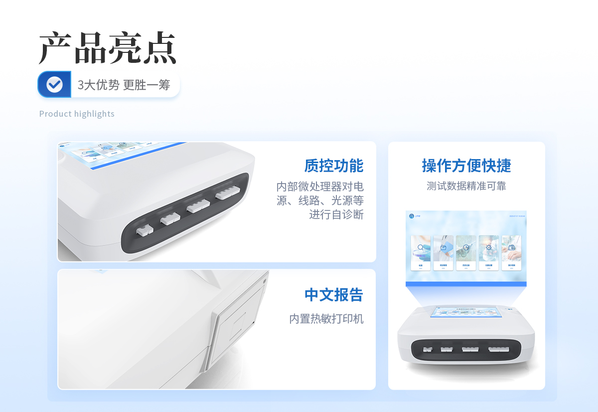 | 1、 Android觸控系統(tǒng)結(jié)合大尺寸高清屏幕,界面友好,操作簡單流暢,無需外接設(shè)備; | 2、 ★單卡+多聯(lián)卡設(shè)計方案,顯著提升檢測效率,滿足批量樣本快速處理需求; | 3、 可以500萬條檢測結(jié)果,支持按日期靈活查詢、預(yù)覽、刪除結(jié)果,并生成多樣化專業(yè)報告。 | 4、 內(nèi)置熱敏打印機,檢測完成即可現(xiàn)場打印標(biāo)準(zhǔn)報告,提升工作效率。 | 5、 關(guān)鍵部件實時自診斷功能,保障儀器長期穩(wěn)定運行。 | 6、 高速有線/無線網(wǎng)絡(luò)及藍(lán)牙,構(gòu)建完善的數(shù)據(jù)監(jiān)控平臺,實現(xiàn)數(shù)據(jù)實時上傳、遠(yuǎn)程查詢、統(tǒng)計分析和監(jiān)管協(xié)同。 | 7、 豐富的接口設(shè)計,輕松連接電腦、U盤、網(wǎng)絡(luò)及上位機系統(tǒng),支持U盤導(dǎo)出。 | 8、 孵育模塊為特定試紙條反應(yīng)提供**溫度環(huán)境。 | 9、 流線型結(jié)構(gòu),緊湊輕便,兼顧實驗室耐用性與檢測需求。 | 10、 二維碼掃描錄入樣本信息,避免人工錯誤。 | 11、 插卡判斷:檢測卡未插入檢測通道不能檢測 | 12、 內(nèi)置質(zhì)控功能,可設(shè)備送檢、設(shè)備自檢、試劑卡自檢 | 13、 檢測方式:孵育檢測、即時檢測(對檢測數(shù)據(jù)復(fù)檢核實) | 14、 檢測曲線:可以對試劑卡的檢測核驗,防止誤判 | 15、 檢測結(jié)果:報告出檢測項目、被測物質(zhì)的濃度、檢測單位、被檢查單位、檢驗員、檢測時間、檢測限等信息可在觸摸屏上顯示,可通過儀器內(nèi)置打印機輸出 | 16、 項目管理:支持檢測項目拓展功能 | 17、 界面設(shè)置:可修改標(biāo)題和頁尾信息,靈活展示儀器信息 |