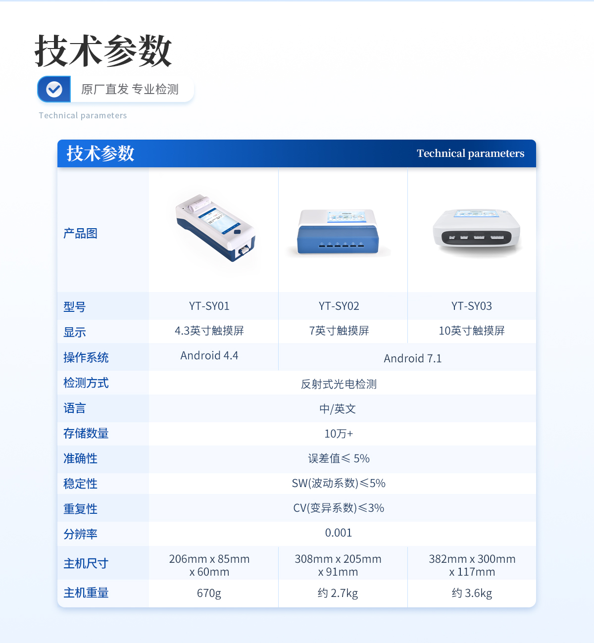 | 1、 10.1英寸電容式觸摸屏,分辨率:1280:x:800,內(nèi)部存儲:1+8GB | 2、 操作系統(tǒng):Android:7.1 | 3、 檢測方式:反射式光電檢測 | 4、 語言:中/英文: | 5、 存儲數(shù)量:10萬+ | 6、 準(zhǔn)確性:誤差值≤:5% | 7、 穩(wěn)定性:SW(波動系數(shù))≤5% | 8、 重復(fù)性:CV(變異系數(shù))≤3% | 9、 分辨率:0.001 | 10、★通道:1個單卡卡槽(70mm*20mm*5.6mm);1個二聯(lián)卡卡槽(70mm*28mm*5.6mm);1個三聯(lián)卡卡槽(70mm*40mm*5.6mm);1個四聯(lián)卡卡槽(70mm*50mm*5.6mm) | 11、檢測時間:<:5秒:(單卡及多聯(lián)卡);可對樣本進(jìn)行膠體金定性> | 12、打印機:熱敏打印機(熱敏打印紙:57*30mm) | 13、數(shù)據(jù)傳輸:WiFi、藍(lán)牙、USB、射頻讀卡、外置掃碼模塊(選配) | 14、數(shù)據(jù)處理:可通過通訊端口進(jìn)行數(shù)據(jù)匯總、上傳監(jiān)管平臺等 | 15、檢測通道孵育檢測一體,溫度范圍::室溫:+5℃:~:60℃ | 16、接口:USB接口:2個;USB-B接口:1個;LAN接口:1個:;DC電源接口:5.5/2.1mm | 17、電源:輸入:AC:220V:±:20V,:50Hz:±:1Hz;輸出:DC:12V,:5A | 18、使用環(huán)境:溫度:0~50℃;濕度:0~90%: | 19、主機尺寸::382mm:x:300mm:x:117mm | 20、主機重量:約:3.6kg |