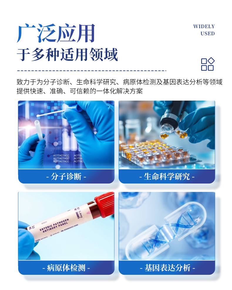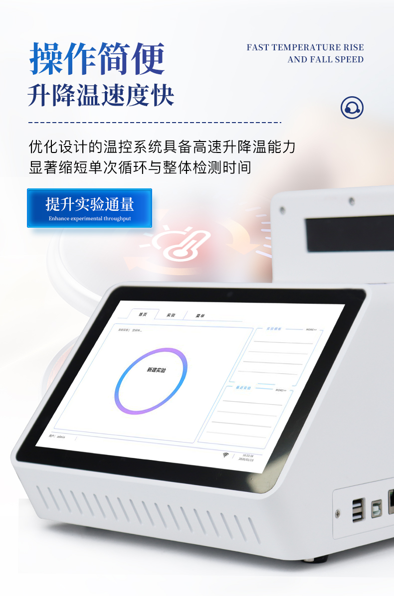 | 1.智能操作系統(tǒng),實(shí)驗(yàn)盡在掌握 | A雙模式靈活控制:支持通過(guò)儀器觸摸屏獨(dú)立運(yùn)行,也支持通過(guò)電腦軟件進(jìn)行遠(yuǎn)程控制與數(shù)據(jù)管理,適應(yīng)不同實(shí)驗(yàn)場(chǎng)景需求。 | B程序更新與預(yù)設(shè):支持在線更新實(shí)驗(yàn)程序,并內(nèi)置豐富的預(yù)設(shè)實(shí)驗(yàn)程序模板,用戶亦可自定義保存常用模版,實(shí)現(xiàn)一鍵快速啟動(dòng),極大提升操作效率。 | C極簡(jiǎn)啟動(dòng)體驗(yàn)(可選配):可定制集成攝像頭掃描系統(tǒng),用戶只需掃描樣品板或程序卡的二維碼,即可自動(dòng)識(shí)別并調(diào)用對(duì)應(yīng)實(shí)驗(yàn)程序,簡(jiǎn)化流程,避免人為設(shè)置錯(cuò)誤。 | D操作簡(jiǎn)單:無(wú)論是觸摸屏界面還是電腦軟件,均設(shè)計(jì)得直觀易懂,新用戶也能快速上手。預(yù)置常用程序模板,進(jìn)一步簡(jiǎn)化操作流程。 | 2.精準(zhǔn)穩(wěn)定的溫控與光學(xué)核心 | A長(zhǎng)久精準(zhǔn)的溫控系統(tǒng):采用進(jìn)口***TEC半導(dǎo)體制冷模塊,控溫精準(zhǔn)(±0.1°C),孔間溫度均勻性**(≤±0.3°C)。系統(tǒng)穩(wěn)定性卓越,長(zhǎng)期使用性能衰減小,校準(zhǔn)周期長(zhǎng)達(dá)數(shù)年,顯著降低維護(hù)成本與運(yùn)營(yíng)中斷。 | B免維護(hù)的靈敏光學(xué)系統(tǒng):配備4個(gè)獨(dú)立LED光源與4個(gè)獨(dú)立光電二極管檢測(cè)器,實(shí)現(xiàn)四通道熒光同步精準(zhǔn)檢測(cè)。采用超長(zhǎng)壽命進(jìn)口光源,設(shè)計(jì)壽命期內(nèi)免維護(hù),無(wú)需額外校準(zhǔn)或更換,保障檢測(cè)結(jié)果長(zhǎng)期一致性與高靈敏度。 | C卓越的數(shù)據(jù)質(zhì)量:實(shí)驗(yàn)線性相關(guān)性高(R2≥0.999),重復(fù)性優(yōu)異(孔間CV值低),確保定量結(jié)果準(zhǔn)確可靠,數(shù)據(jù)置信度高。 | 3.**便捷的數(shù)據(jù)與輸出管理 | A多重?cái)?shù)據(jù)導(dǎo)出方式:支持通過(guò)USB存儲(chǔ)設(shè)備直接拷貝,或經(jīng)由Wi-Fi無(wú)線網(wǎng)絡(luò)傳輸數(shù)據(jù)至本地服務(wù)器或云端,方便靈活,滿足各類實(shí)驗(yàn)室數(shù)據(jù)管理習(xí)慣。 | B豐富的報(bào)告導(dǎo)出與打印:支持生成并導(dǎo)出多種格式(如PDF、Excel)的實(shí)驗(yàn)報(bào)告。儀器兼容USB熱敏打印機(jī)、藍(lán)牙無(wú)線打印機(jī)及常規(guī)A4打印機(jī),可直接在儀器上或通過(guò)電腦一鍵導(dǎo)出并打印專業(yè)報(bào)告,便于結(jié)果存檔與即時(shí)分享。 | 4.快速**與堅(jiān)固耐用 | A升降溫速度快:優(yōu)化設(shè)計(jì)的溫控系統(tǒng)具備高速升降溫能力,顯著縮短單次循環(huán)與整體檢測(cè)時(shí)間,提升實(shí)驗(yàn)通量。 | B超長(zhǎng)使用壽命:核心部件均選用工業(yè)級(jí)耐用材料與設(shè)計(jì),整機(jī)運(yùn)行穩(wěn)定可靠,致力于為用戶提供長(zhǎng)久的投資回報(bào)。 | 三、應(yīng)用場(chǎng)景基礎(chǔ)科學(xué)研究、病原體檢測(cè)、肉制品摻假、轉(zhuǎn)基因檢測(cè)、食品安全檢測(cè)、藥物開(kāi)發(fā)及合理用藥、基因表達(dá)、水體監(jiān)測(cè)、松材線蟲(chóng)檢測(cè)、寵物檢測(cè)、養(yǎng)殖業(yè)疫病檢測(cè) |